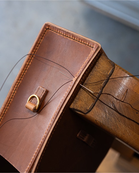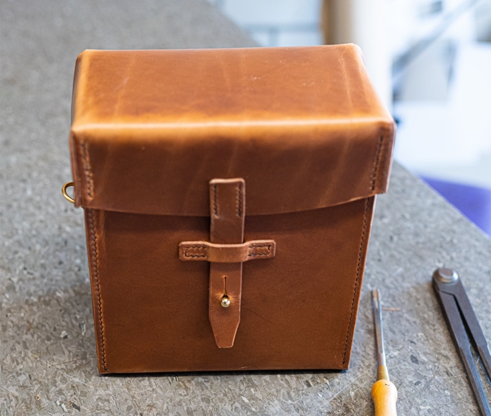 Planen, zuschneiden, von Hand nähen und verputzen. Aus Zeugleder natur speziell eingebrannt, das Innenleben ist aus Ziegenleder vegetabil natur.